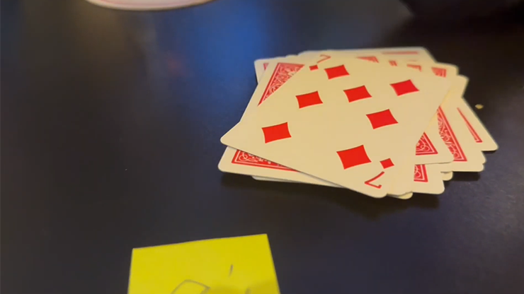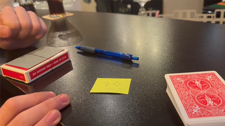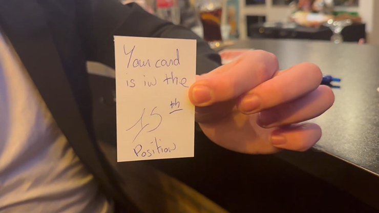 Place a deck of cards on the table. An envelope is attached to the case using an elastic band and a post-it is stuck to the back of the case. Ask the spectator to choose any card in their head. He can change if he wants until you ask him to say his card out loud so you can write it on the post-it as a final choice. Take your prediction envelope, open it. Inside you will find a paper with writing "your card is in ... position" ask the spectator to count the number of cards written on the paper. Once arriving at the card, the spectator is asked to turn the card over. As if by magic it is the one he thought of.