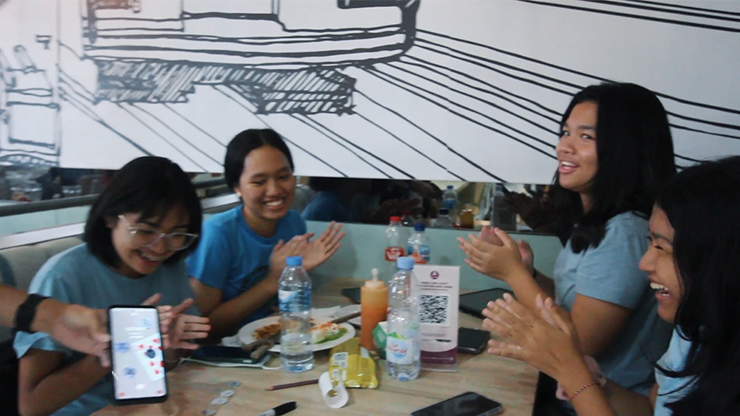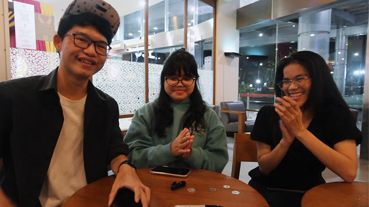The audience is given 4 coins and asked to put a cross on the three coins they don't like. The magician shows a smartphone wallpaper showing a picture of three coins marked with a cross according to the audience's choice, 100% correct.