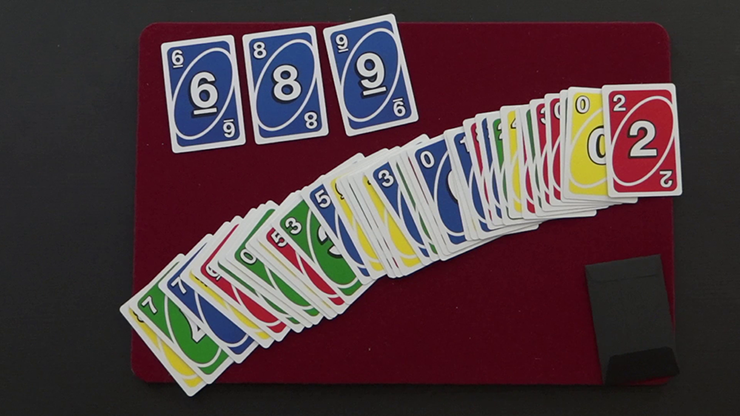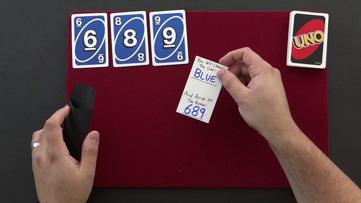 So what's the effect? You briefly show an envelope in your front pocket and mention that it will be important a bit later. A pack of UNO cards is now introduced and a participant names any of the four colors in the game to be their target color. They take the cards and genuinely shuffle them into a truly random order. They now look through the shuffled pack and remove the first three cards of their target color that they come to. The numbers on these cards are added together to arrive at a sum. The envelope is now removed from your pocket and turned around to show one number was written on it - the sum of the three numbers! Even more impressive, inside the envelope is a prediction of the SPECIFIC COLOR they named and the EXACT THREE NUMBERS they arrived at!